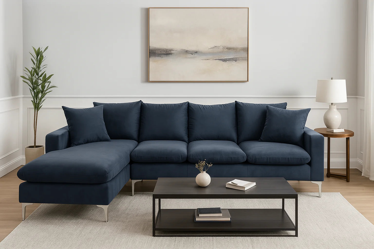Enhance your living space with this elegant black velvet sectional sofa, designed for both comfort and modern appeal. The deep navy hue and soft velvet upholstery create a luxurious feel, while the reversible chaise offers flexible seating arrangements to suit your space.